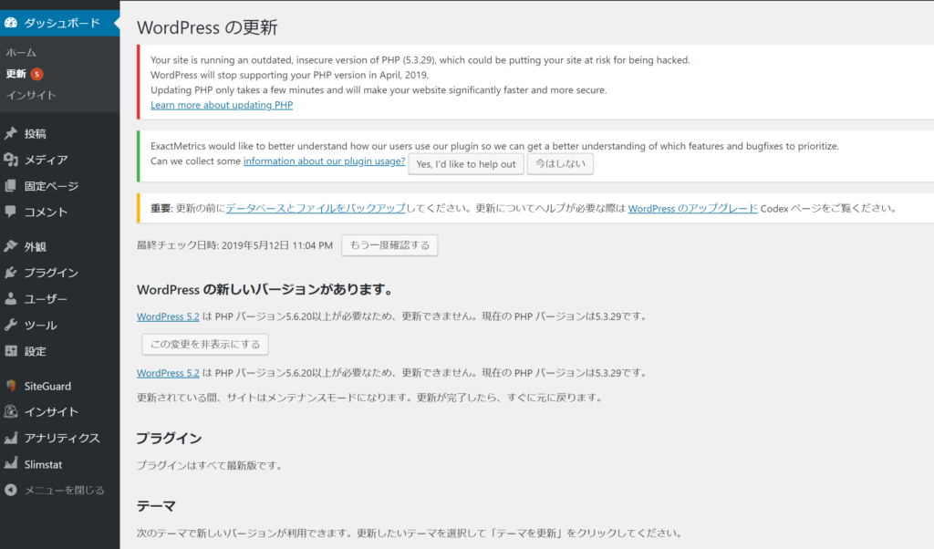 さて WordPressの管理画面からWordPressのバージョンが古いので更新しなさいと表示されます。そこでWordPressのバージョンを更新しようとするのですが、今度はPHPのバージョンが古いのでWordPressのバージョンを更新できないといわれてしまいます。