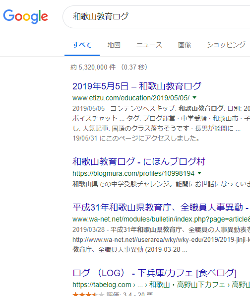 さて、5月1日にブログを開設したものの、5月19日においてGoogle検索にて「和歌山教育ログ」を検索しても見つかりませんでした。抜群の検索力があるGoogle検索にてみつけられないとは困った話です。