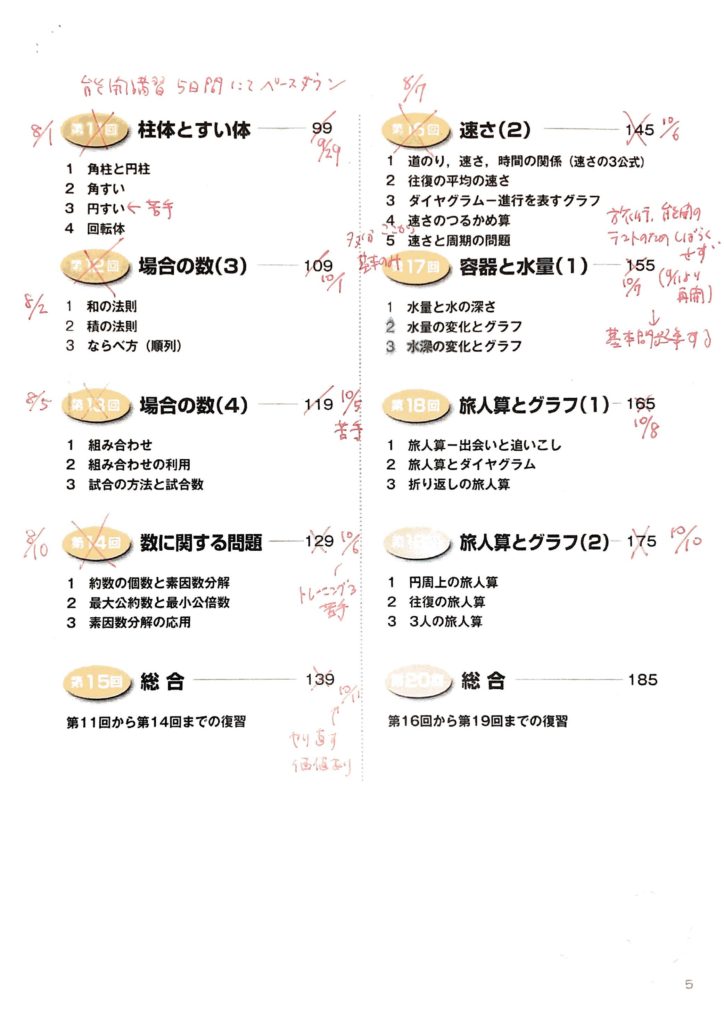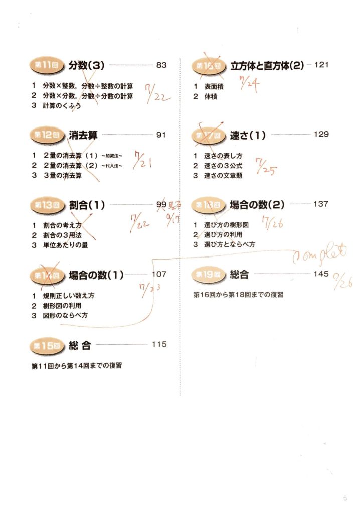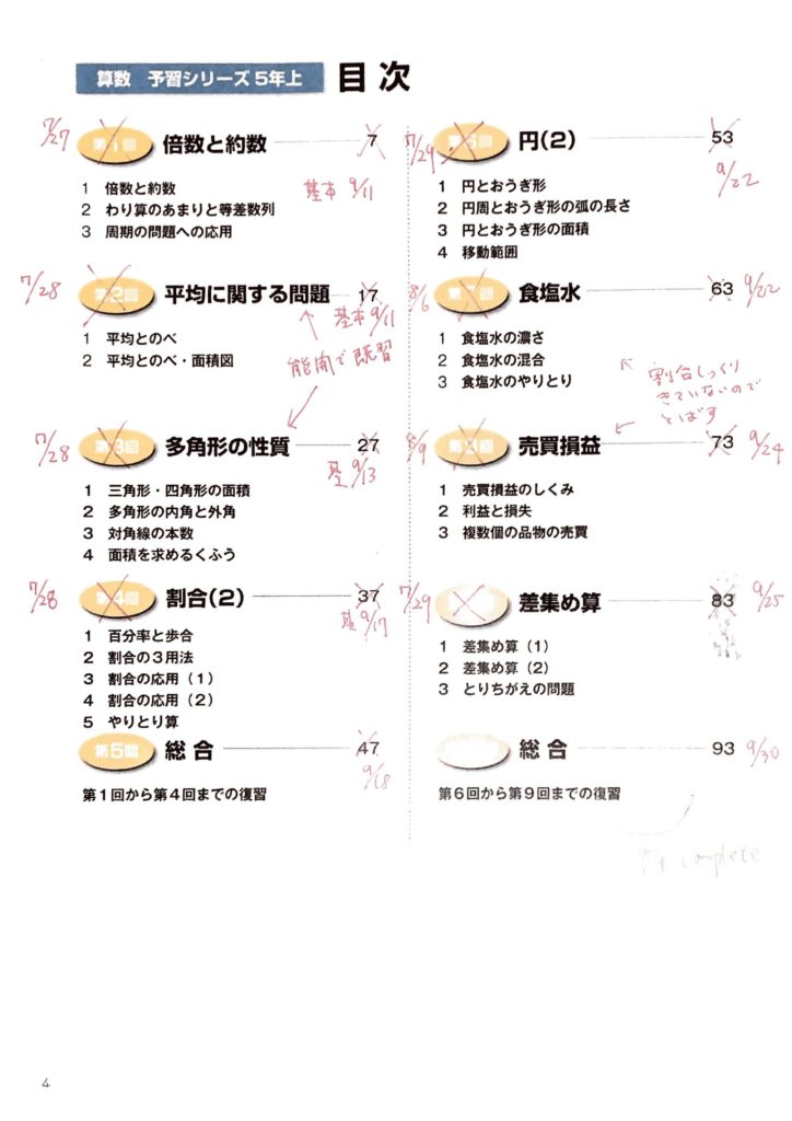下記のメモをみてみると(ブログに掲載する予定もなかったので見苦しい字ですいません)、夏休みは1日で3回分進んだこともありますし(中学受験範囲の20分の1!)、夏休み明けの9月は1ヶ月ぐらい1回分も進まなかったこともあります。おそらく二学期の夏休み明けしばらくは小学校いくだけで疲れてしまったり、塾のテストなどがあったんでしょうね。