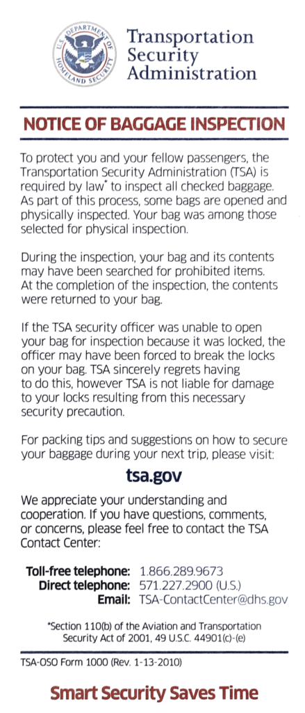 グアムからの帰国してスーツケースをあけると、下記のような紙が入っていました。私のスーツケースがグアムの空港にて開錠され、チェックされたようです。